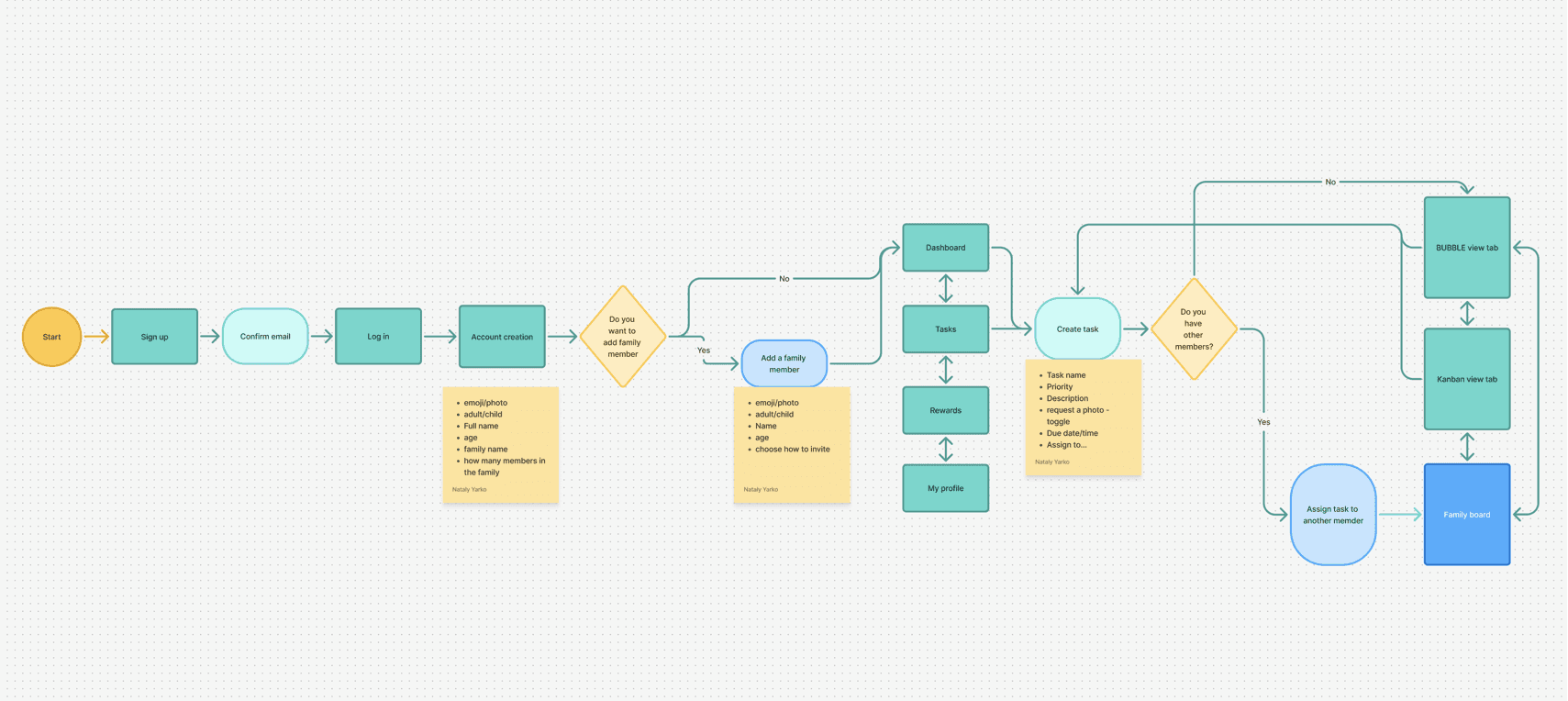 Before touching Figma, I mapped the full user flow with decision points and data requirements. Two questions shaped the entire architecture: whether you're setting up alone or as a family, and whether a task belongs to you or someone else. Those two branches determined every screen that followed — including the two view modes, bubble and Kanban, that emerged naturally from the logic rather than being designed in advance.