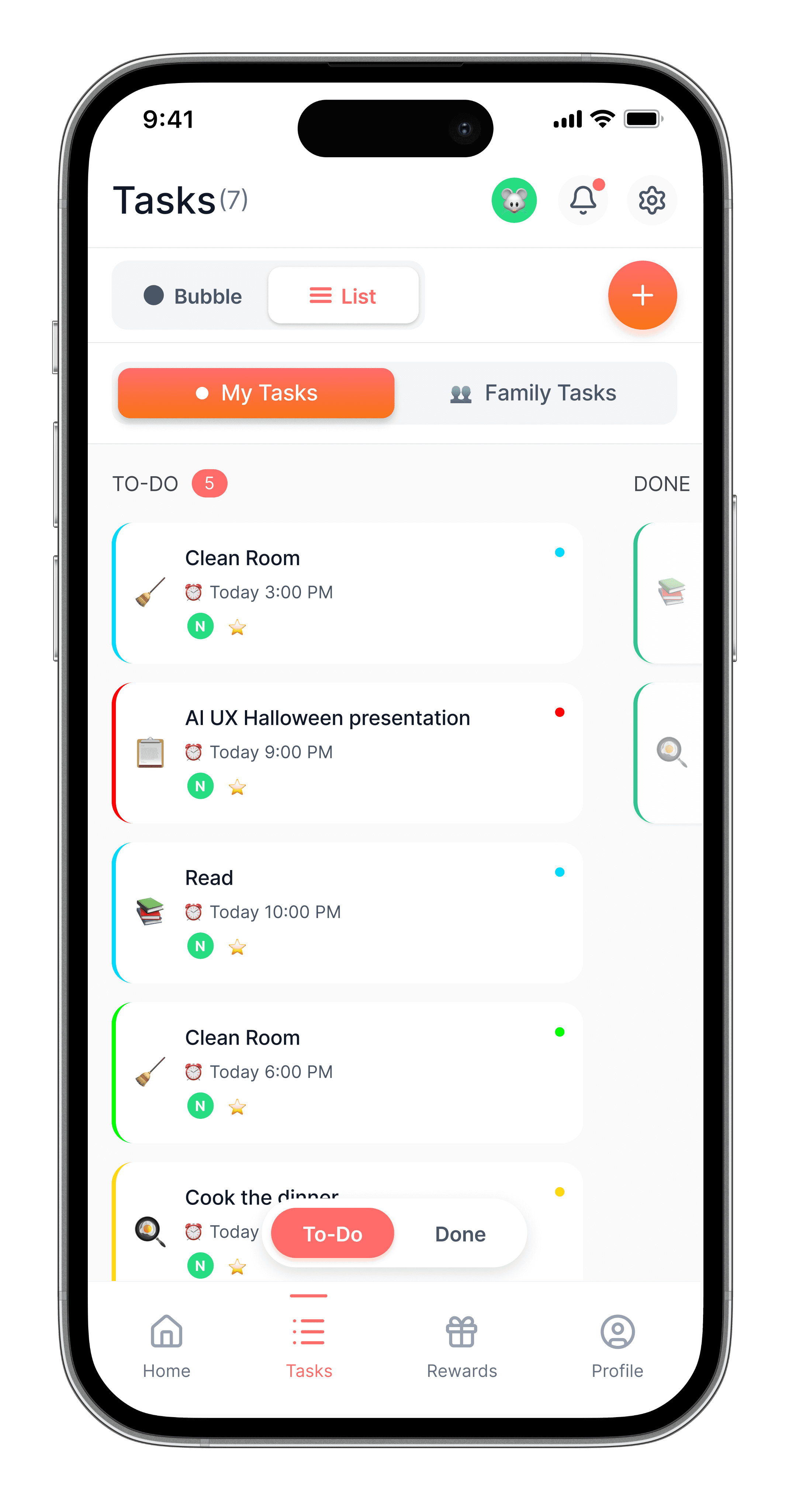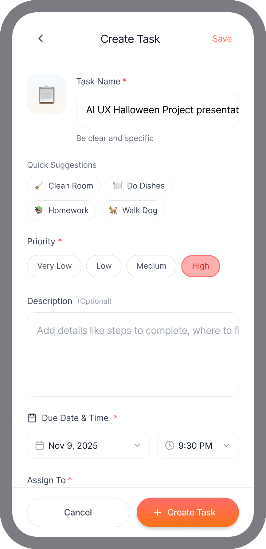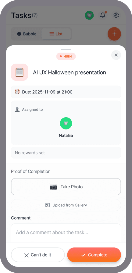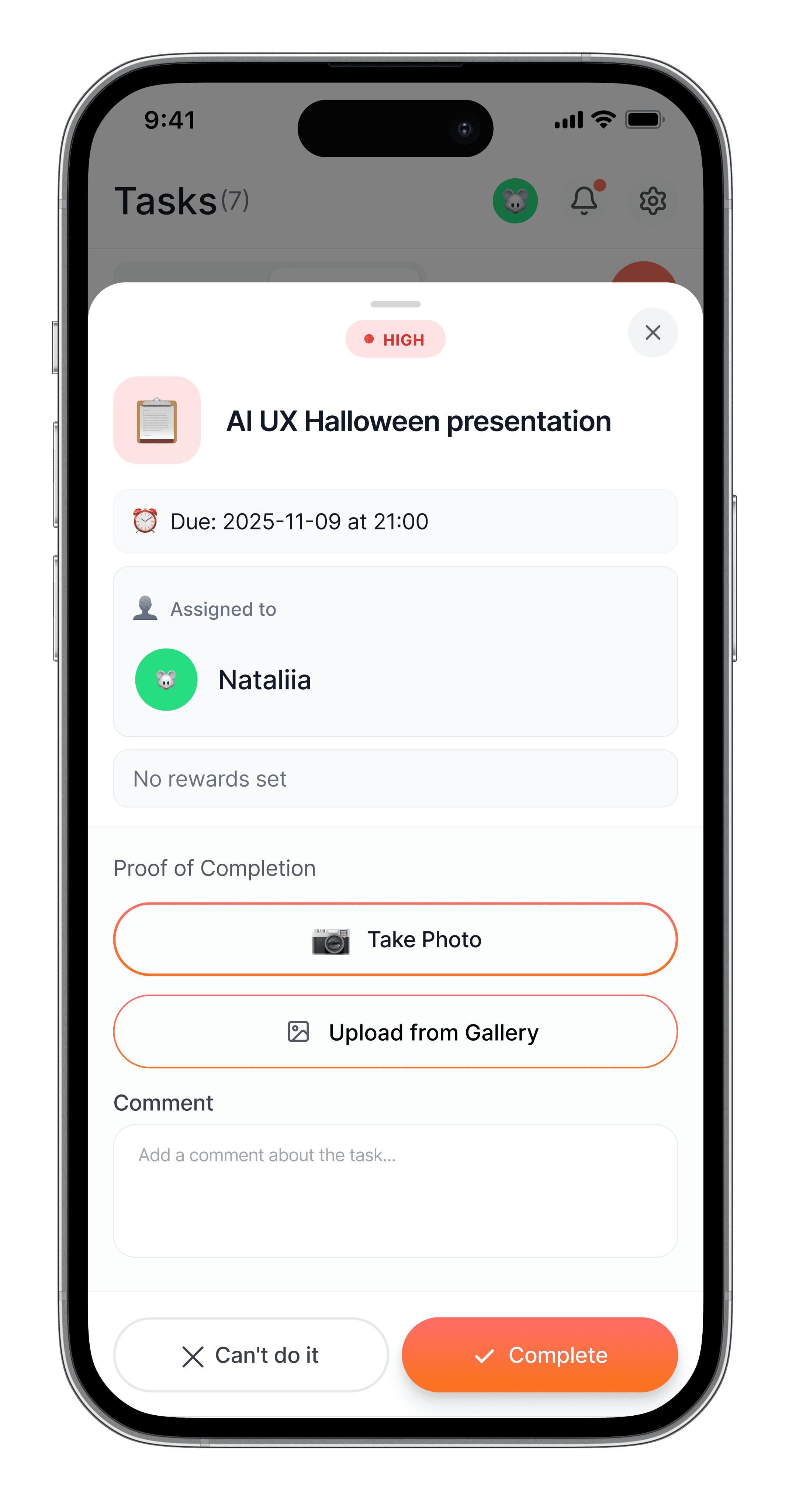 3. The best features come from lived experience, not brainstorming. Photo proof wasn't in any framework. It came from being a parent who knows what "I did it" actually means in a house with a 13-year-old.