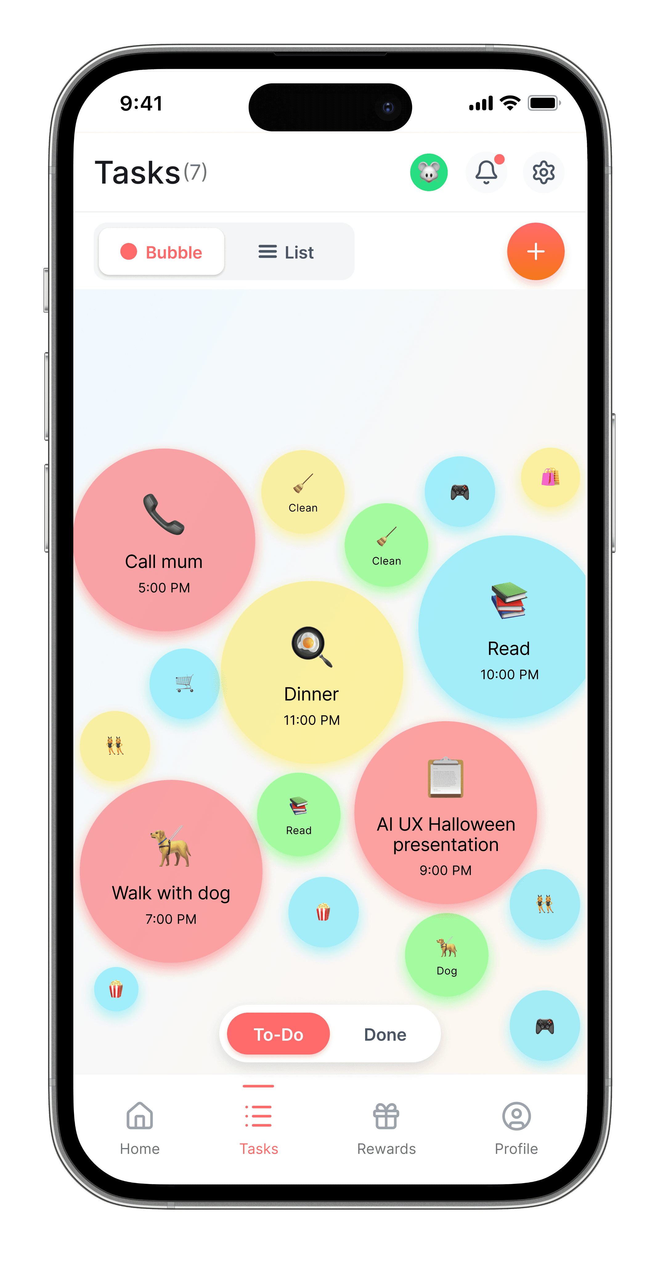 Tasks shouldn't feel urgent until they actually are. A list treats everything equally. A bubble system treats things proportionally — small and unobtrusive when there's time, impossible to ignore when there isn't.