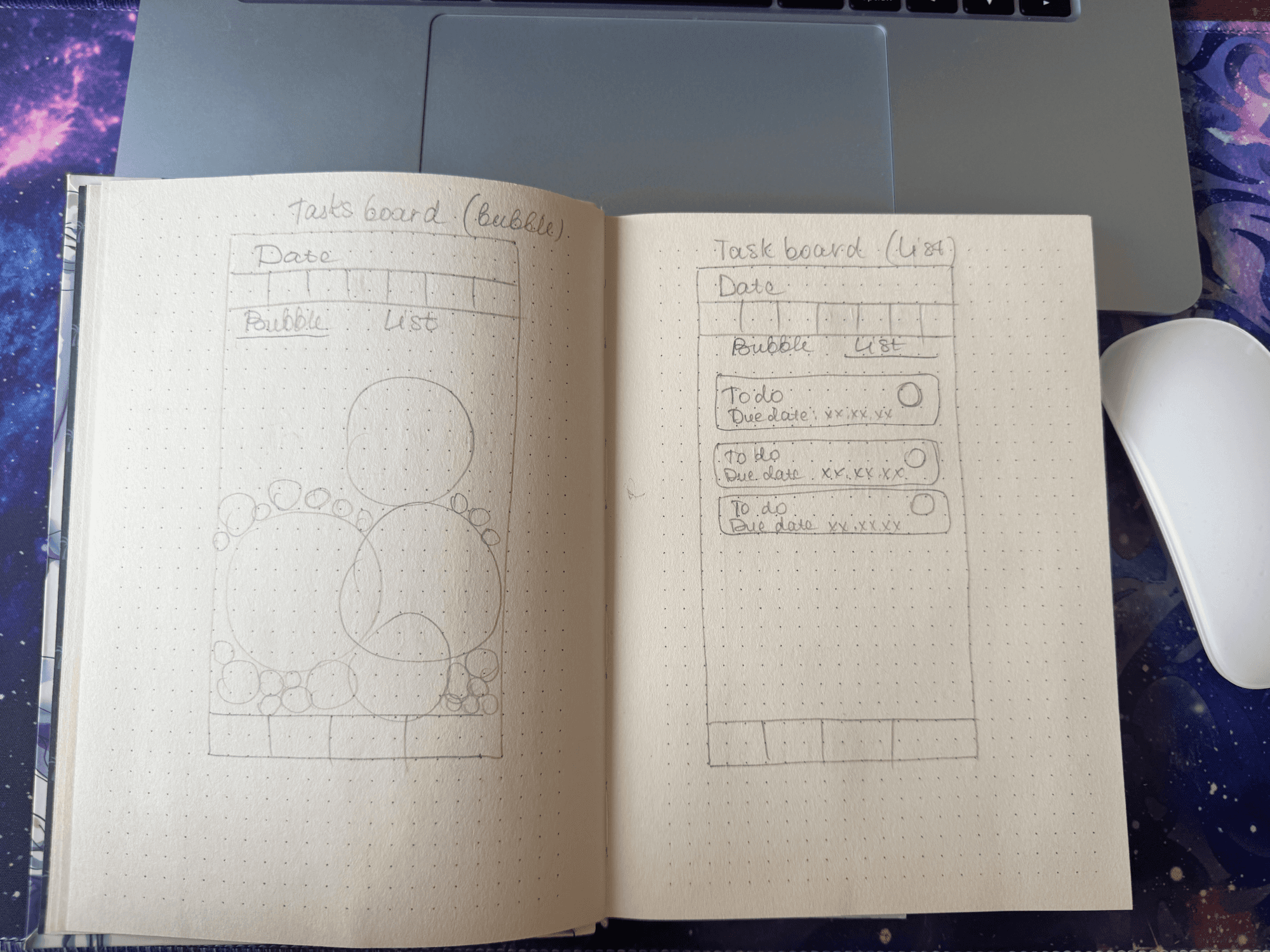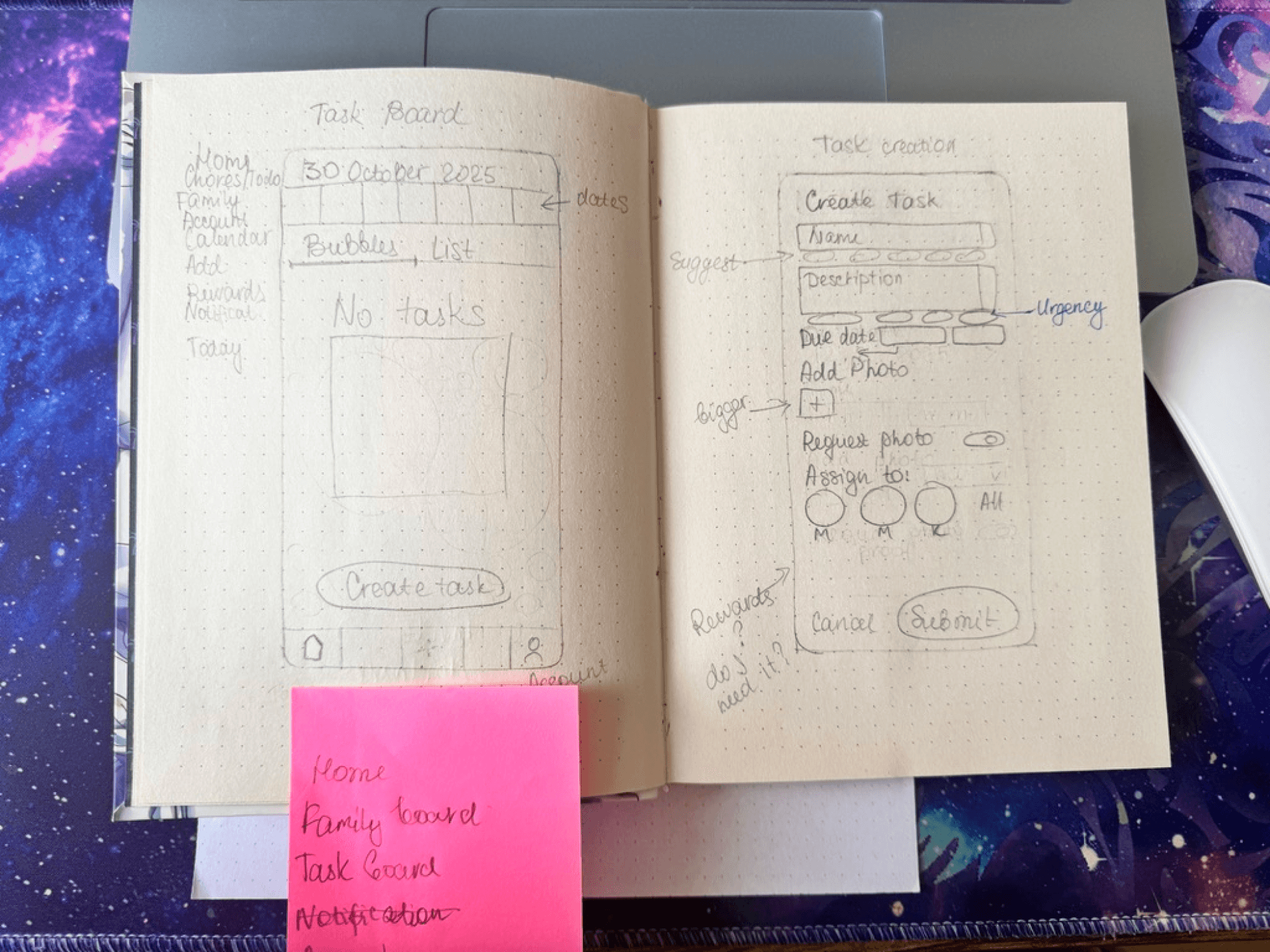 Before writing a single prompt, I sketched the core screens by hand — bubble view vs list view, task creation form, onboarding flow. The "Request photo" toggle and the question "Rewards — do I need it?" both came from this session. Sketching forced decisions that no amount of prompting would have surfaced.